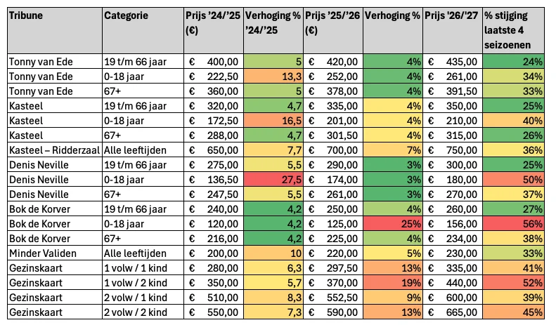 Ook dit seizoen stijgen de prijzen voor de supporters van Sparta. In onderstaande tabel kan je zien hoe dat er dan uit ziet en wie in verhouding de meeste stijging voor zijn Spartaanse kiezen krijgt: