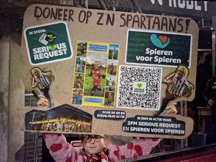 Iedereen die nog even na wilde genieten van de eclatante overwinning van Sparta op NAC en de samenvatting heeft bekeken heeft haar kunnen zien: Mare uit Vlaardingen. Mare is een jonge Spartaanse die meedoet aan de actie Serious Request en geld inzamelt voor Spieren voor Spieren. Als toonaangevend Spartaans medium geeft ITWM graag aandacht aan de sympathieke actie van Mare. Doneren kan via deze link en via de QR op de foto bij dit artikel. Laat je hart spreken en geef gul.