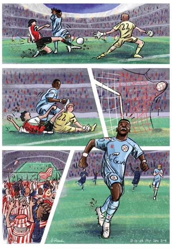 De 1-3 voorsprong. Deze voorsprong uit handen geven. En de 3-4 in de laatste seconde! De ‘comic’ die Alex van dit laatste moment heeft gemaakt kan je ergens ophangen in je kamer, op kantoor, geven als aandenken aan een mede-Spartaan, als gift voor je beste Feyenoord-vriend of in een la leggen om later nog eens terug te bekijken. Wellicht kan Maurice Steijn er eentje aan zijn zoon cadeau doen. Maar misschien kan Sparta hem aan ook Maurice Steijn cadeau doen. Want onze trainert heeft wel recht op een felicitatie + cadeau. Mede dankzij de overwinning op Zuid is hij namelijk verkozen tot Rinus Michels Coach van de Maand januari. Onze felicitaties! We hebben van de overwinningen genoten – en wat ITWM betreft mag de schitterende reeks nog wel even doorgezet worden!
