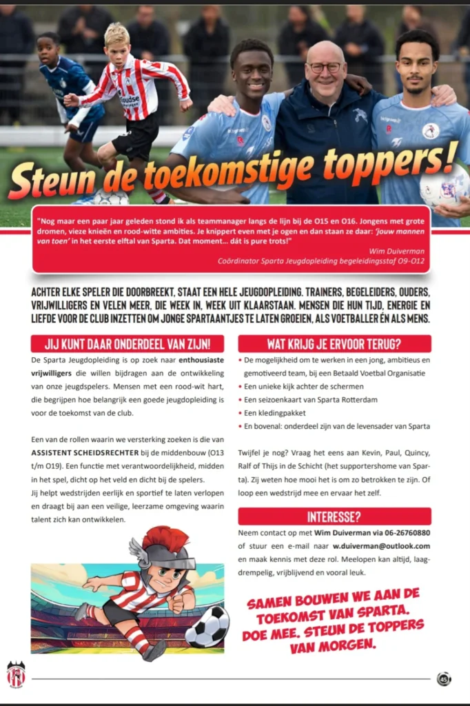 De Jeugdopleiding van Sparta is op zoek naar vrijwilligers. Vrijwilligers zijn van groot belang voor Sparta en in het bijzonder voor de Jeugdopleiding. Zonder de inzet van vrijwilligers hadden Marvin Young, Lushendry Martes, Ayoni Santos, maar ook Denzel Dumfries, Memphis Depay en talloze andere voetbalprofs niet geweest waar ze nu zijn.